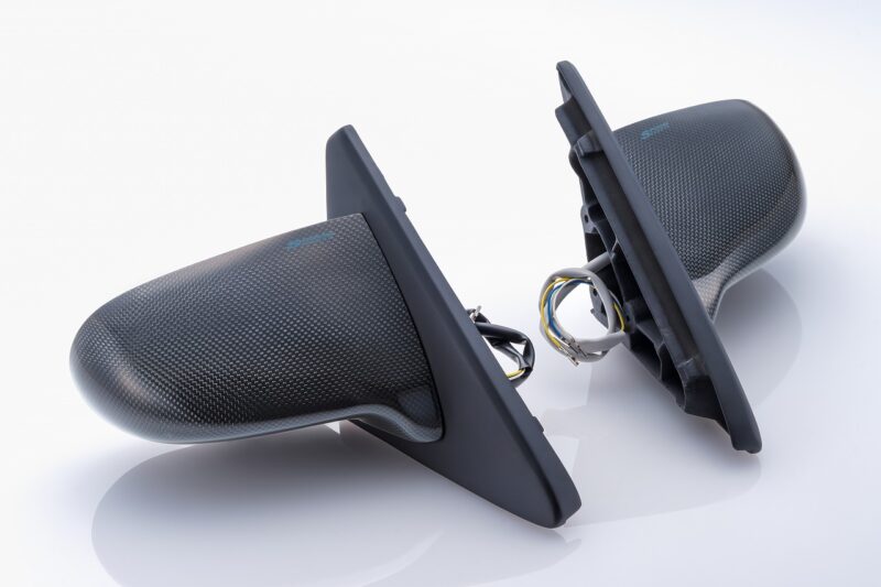 再生産を熱望する声におされ、カーボンケースの製造は精密金型から新造しドライカーボン化、ミラーは曲率1200Rでワイド化、光学式ブルーワイドミラーを採用し、夜間の後続車ライトでも眩しくはありません。ミラーハウジング上面には、「SPOONSPORTS」のロゴをさりげなく成型時に張り込みました。